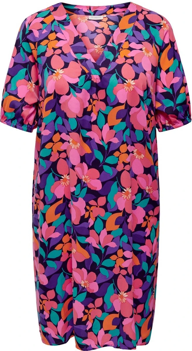 Mooie frisse meerkleurige jurk met bloemenprint van het merk Only Carmakoma. Jurk heeft een V-hals en korte mouw met aan het eind een elastiek.