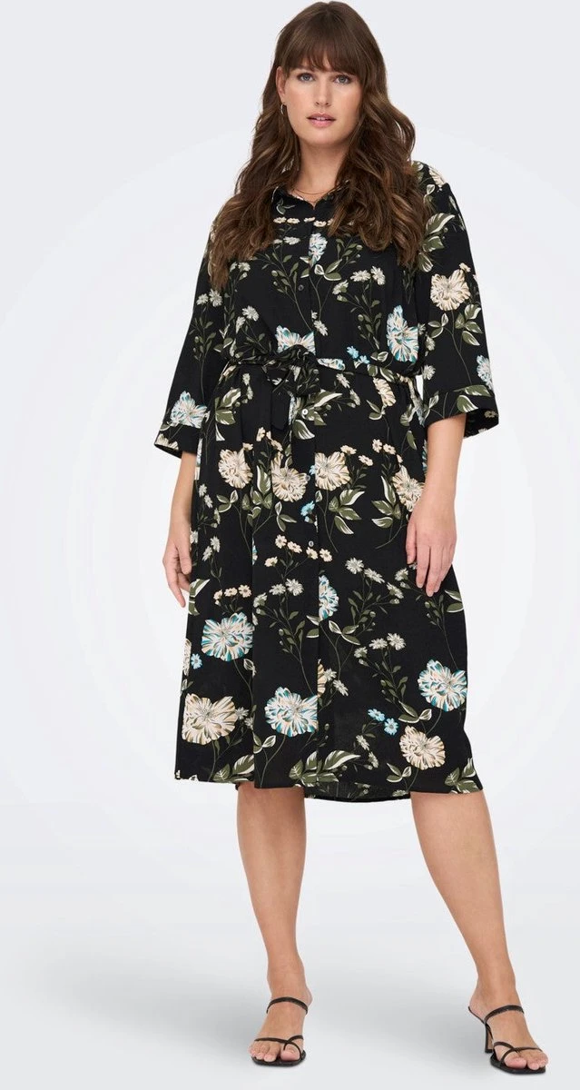 Blousejurk die ruim over de knie valt en een ceintuur om de taille heeft. Driekwart mouwen die speels afgewerkt zijn. De heldere, kleurrijke bloemen geven de jurk kleur.