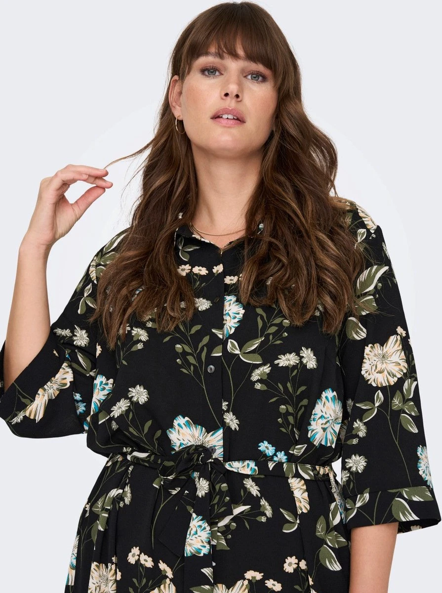 Blousejurk die ruim over de knie valt en een ceintuur om de taille heeft. Driekwart mouwen die speels afgewerkt zijn. De heldere, kleurrijke bloemen geven de jurk kleur.
