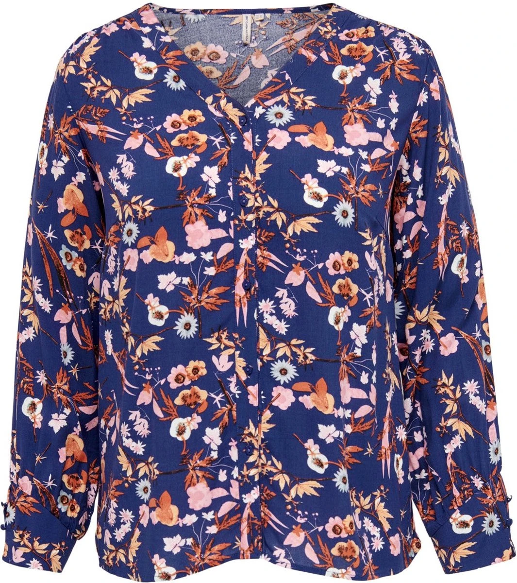 Blauwe blouse met v-hals en lange mouwen. De blouse valt achter langer dan aan de voorkant. Heldere kleuren maken deze blouse ideaal voor het voorjaar of de koudere dagen in de zomer.