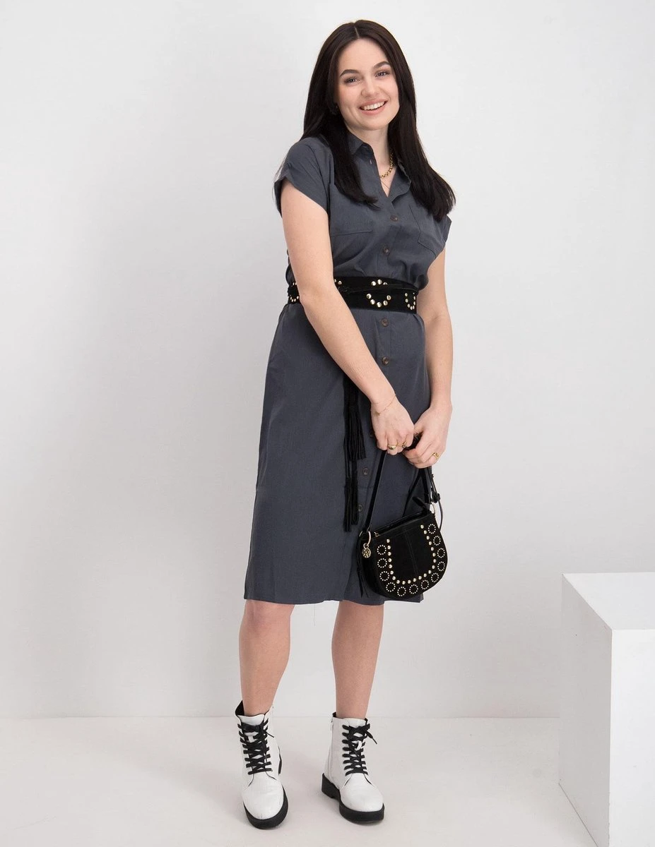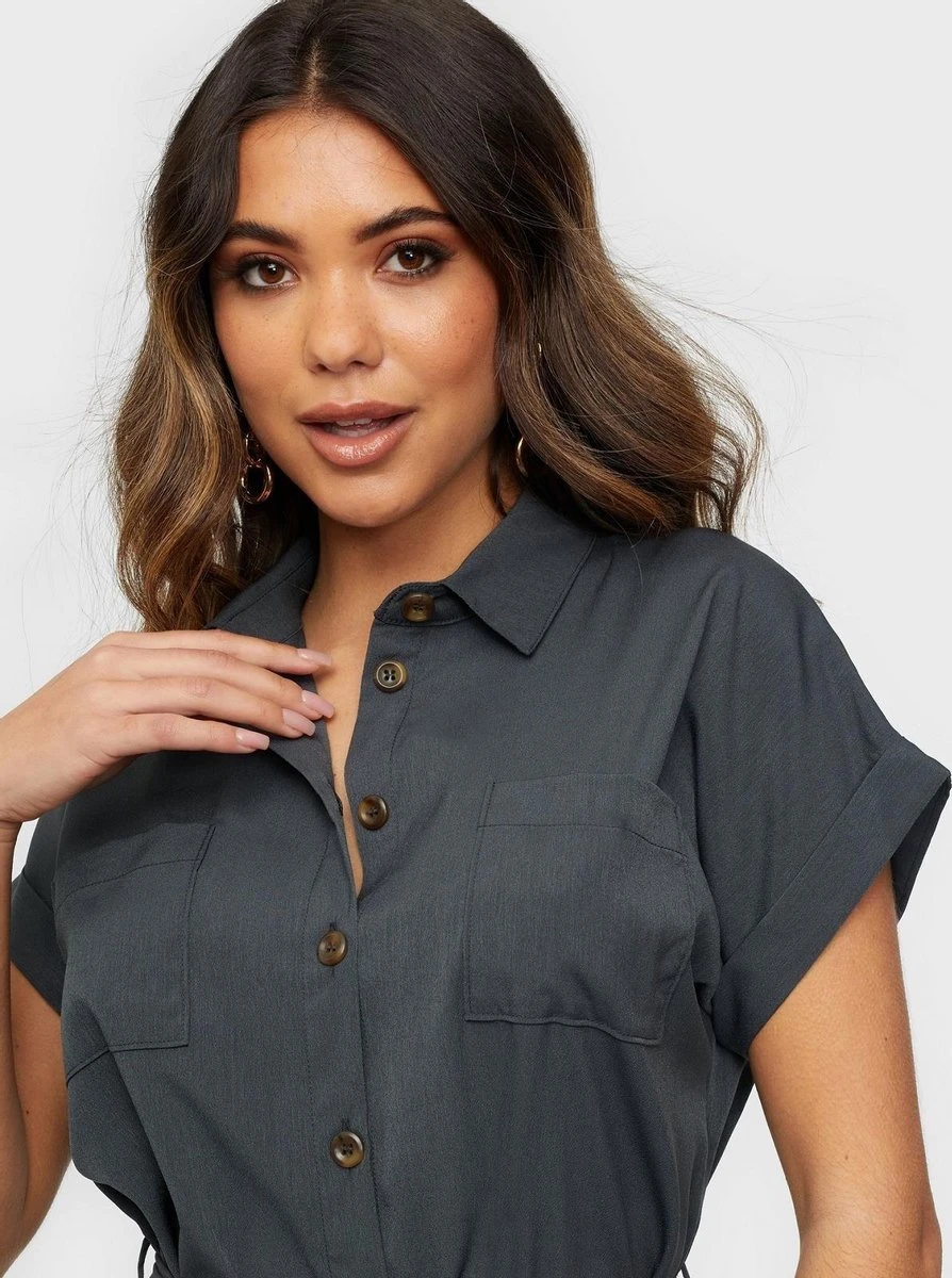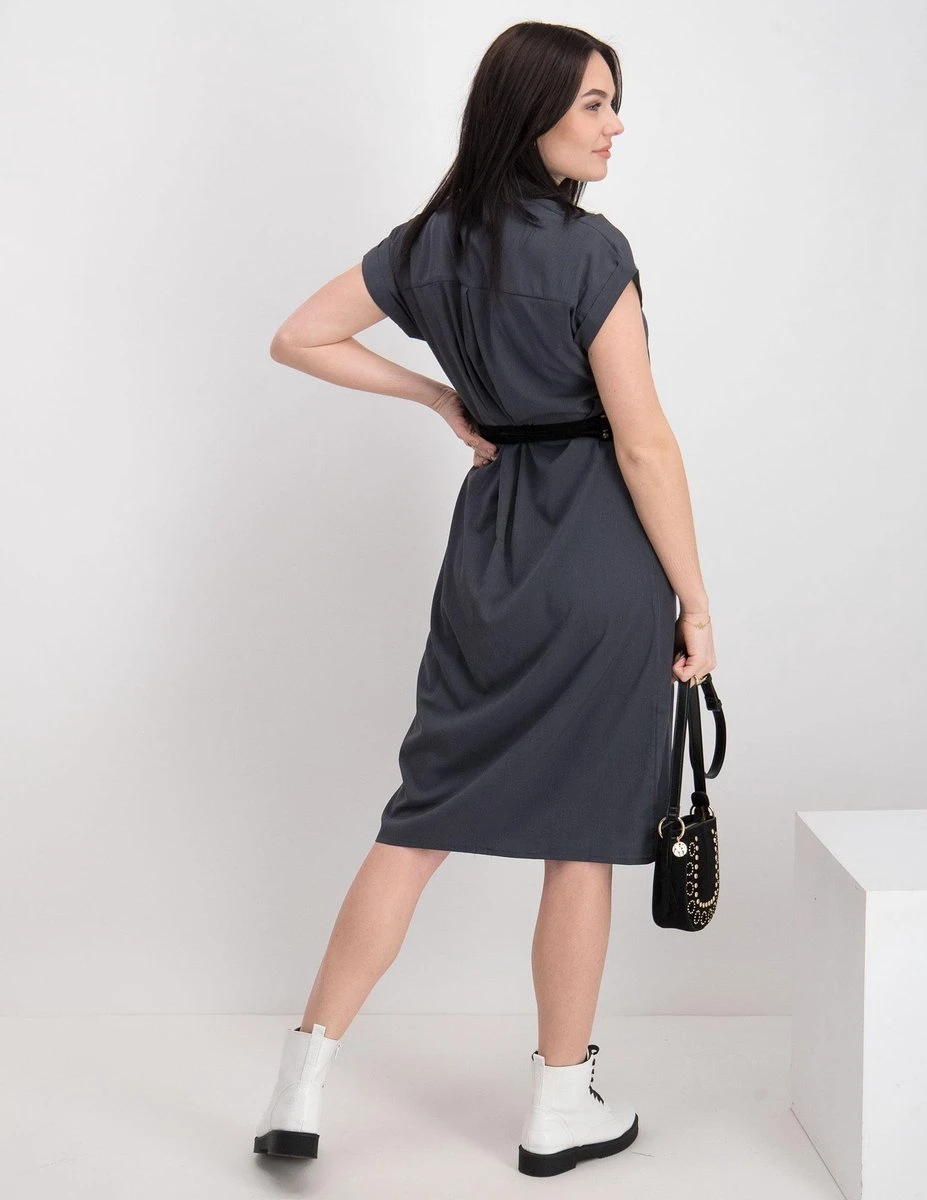 Casual en de hele dag te dragen. Geweven. – Type product : Jurk- Mouw lengte : Korte mouwen- Sluiting : Knoopsluiting- Lengte : Boven de knie- Voering : Voering van 100% polyester- Details : Riem die de taille accentueert